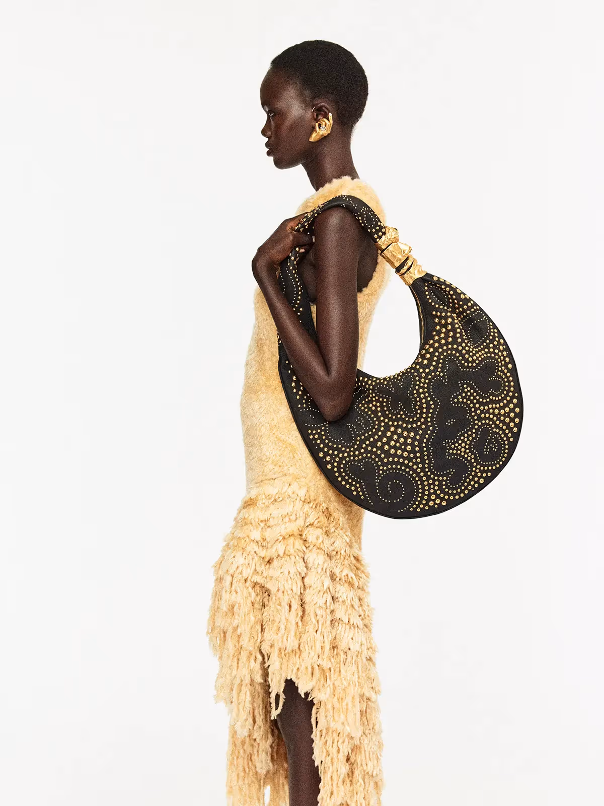 The Soufflé returns with its smooth, rounded silhouette and signature shoulder strap adorned with iconic trompe l’oeil inspired hammered brass hardware that echoes human anatomy. What's new this season lies in the carefully chosen materials and embellishments, giving the bag an even more luxurious dimension that embodies Schiaparelli's bold and distinctive identity.