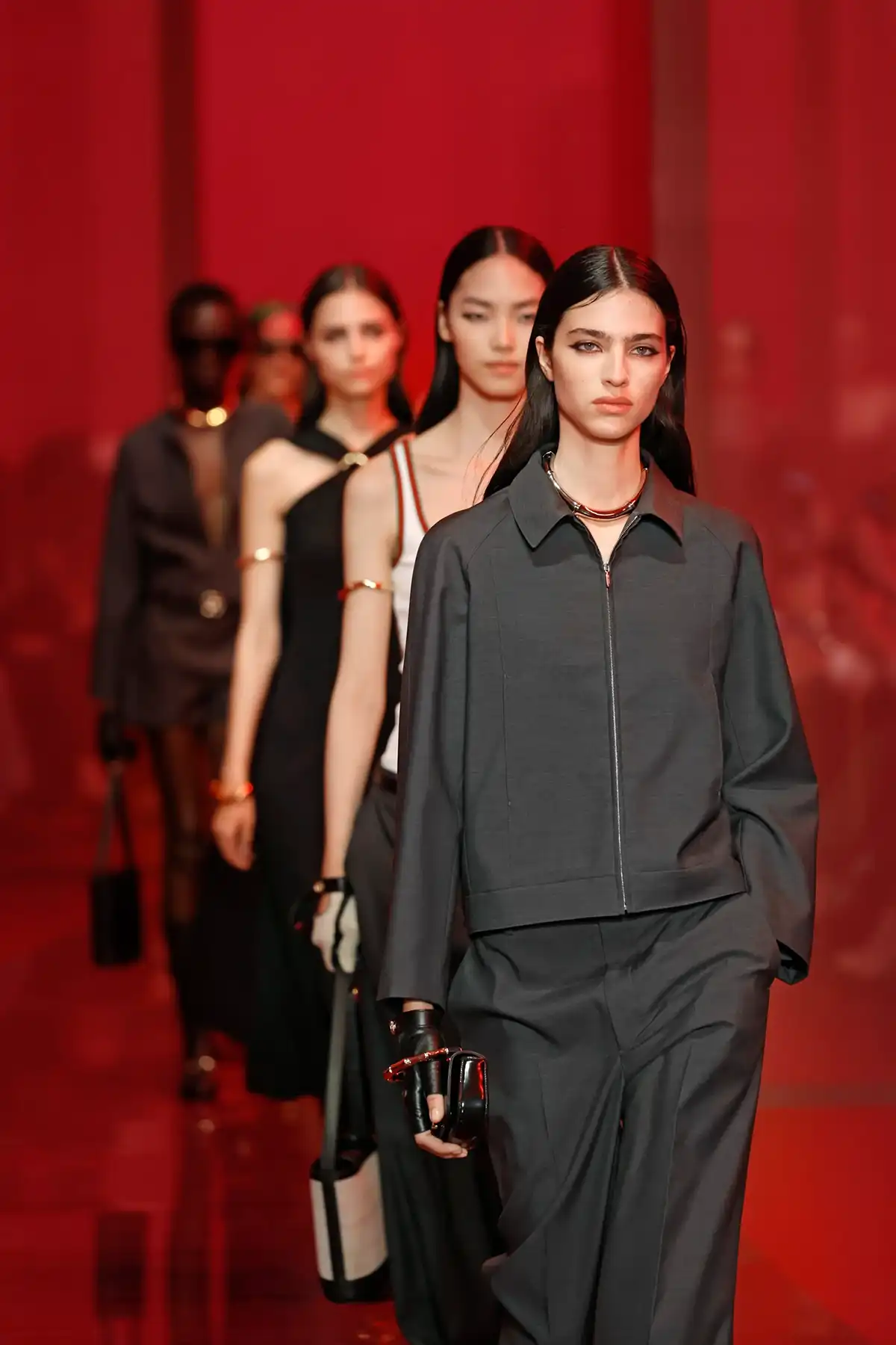 Giorgio Armani showcased serene sophistication. Shades of gray and navy dominated the runway, accented with subtle golden touches that added understated luxury. The cuts were precise and practical, with delicate details such as hidden buttons and fine embroidery. The calm music and minimalist presentation highlighted every moment on the runway, proving that classic elegance endures, no matter how fashion trends evolve.