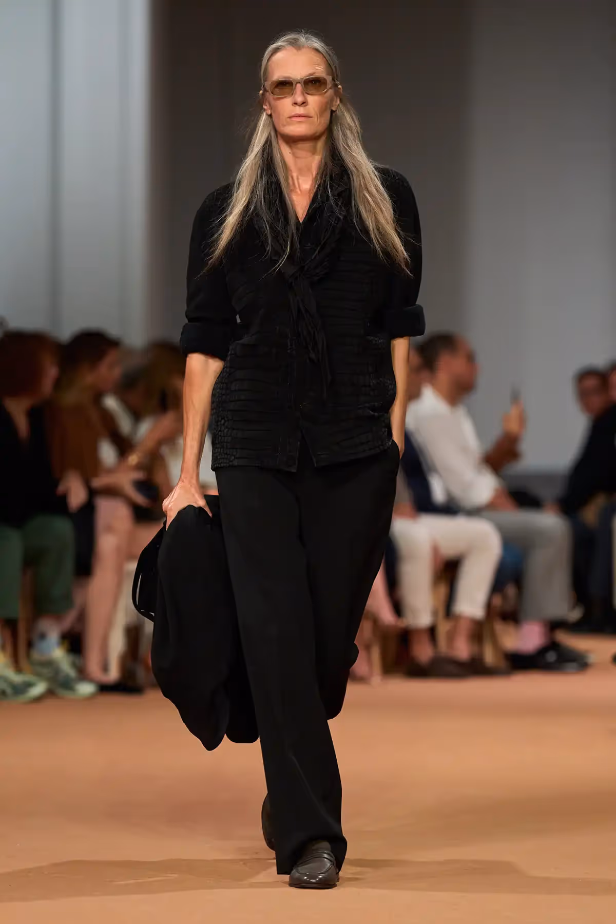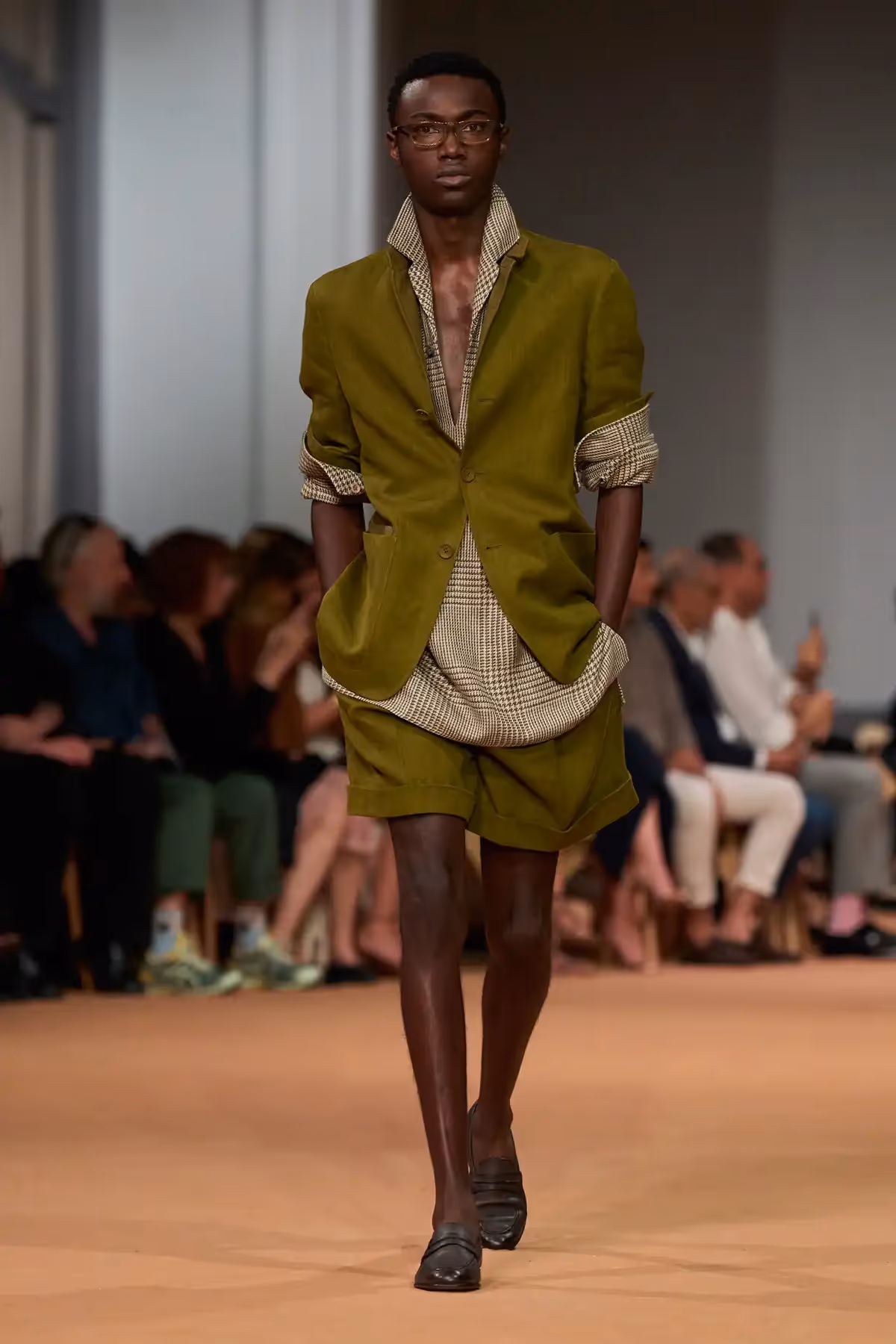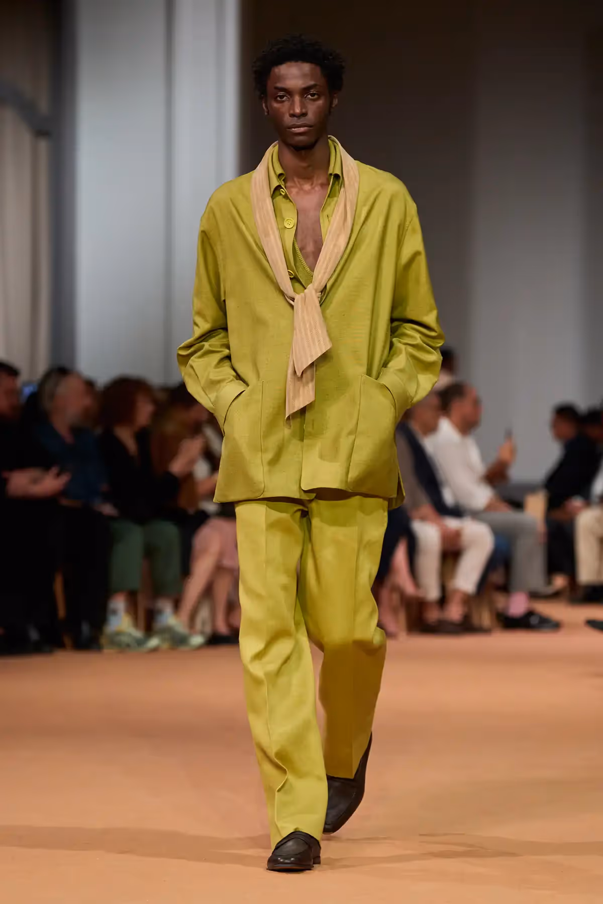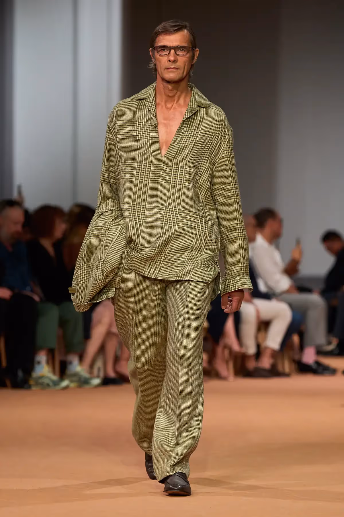 What further elevated the presentation was the luxurious mix of materials. The collection featured a sophisticated blend of lightweight leather, soft silks, and airy wools all chosen for their ability to drape naturally while maintaining sharp form. The interplay of matte and sheen, texture and transparency, created subtle layers of depth and movement. Despite the use of traditionally heavy fabrics like leather, nothing felt rigid or overworked; instead, there was a remarkable sense of lightness and ease throughout. It was a masterclass in how modern menswear can merge technical excellence with understated opulence.